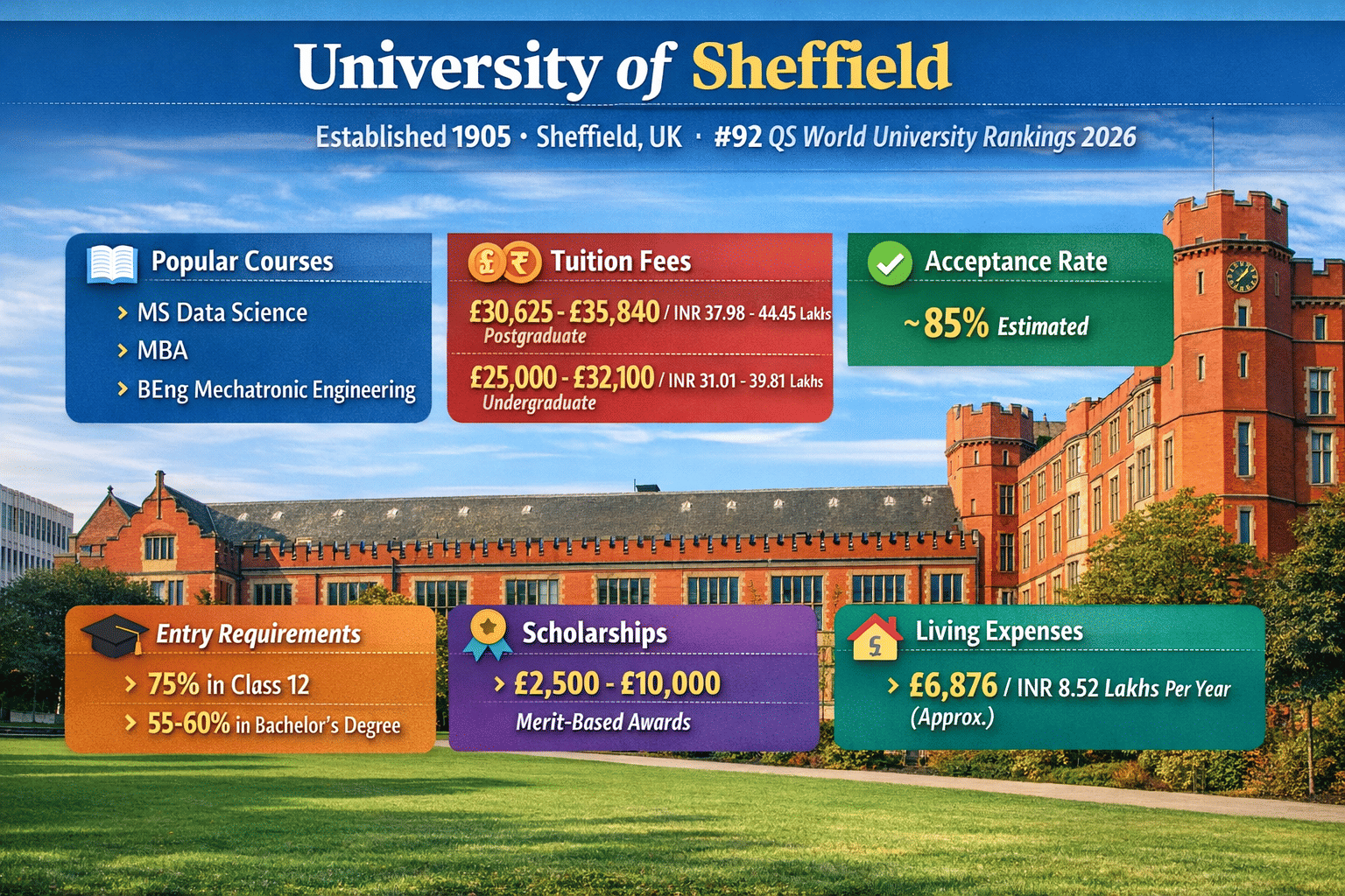 The University of Sheffield does not officially publish an acceptance rate, but third-party sources estimate it at around 85%. For admission, students generally need a minimum of around 75% in Class 12 for undergraduate programs and around 55-60% in a bachelor’s degree for postgraduate programs. In addition, students must provide proof of English language proficiency through IELTS or equivalent tests.