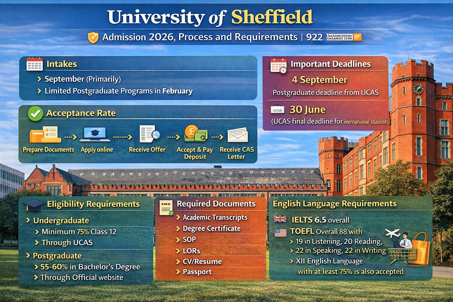 The University of Sheffield is known for its strong academic reputation in fields such as engineering, business, computer science, and health sciences. The university primarily offers admission in the September intake (main intake), while a limited number of postgraduate programs may be available in the February intake. The deadline for the September 2026 are: