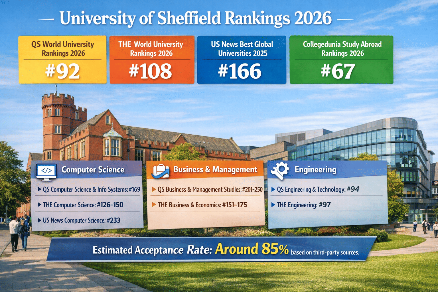 Ans. The University of Sheffield’s 2026 rankings vary across major global ranking systems. It is ranked #92 in the QS World University Rankings 2026, #108 in the Times Higher Education (THE) World University Rankings 2026, and #166 in the US News Best Global Universities rankings.