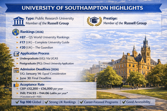 The University of Southampton (UoS) is a prestigious member of the research-intensive Russell Group of Universities in UK. With over 150 years of history, UoS has built a strong national and international reputation for excellence. Globally ranked 87th in QS World University Ranking and #129 THE World University Ranking. UoS is truly global, with over 10,000 international students from 130 countries, according to 2025 Official data. International students can choose from 80+ undergraduate, postgraduate taught, and research programs at this university.