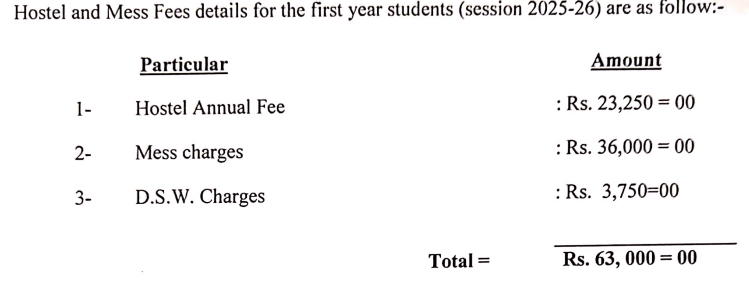 10,000 per year, with mess charges averaging Rs. 18,000 per semester. Rooms are typically shared, transitioning from triple to double occupancy, with single rooms available for final-year students. Meal quality is average, but students manage the menu, allowing for adjustments. Facilities include 24x7 electricity and water, basic furniture, sports courts, and occasional internet connectivity.
