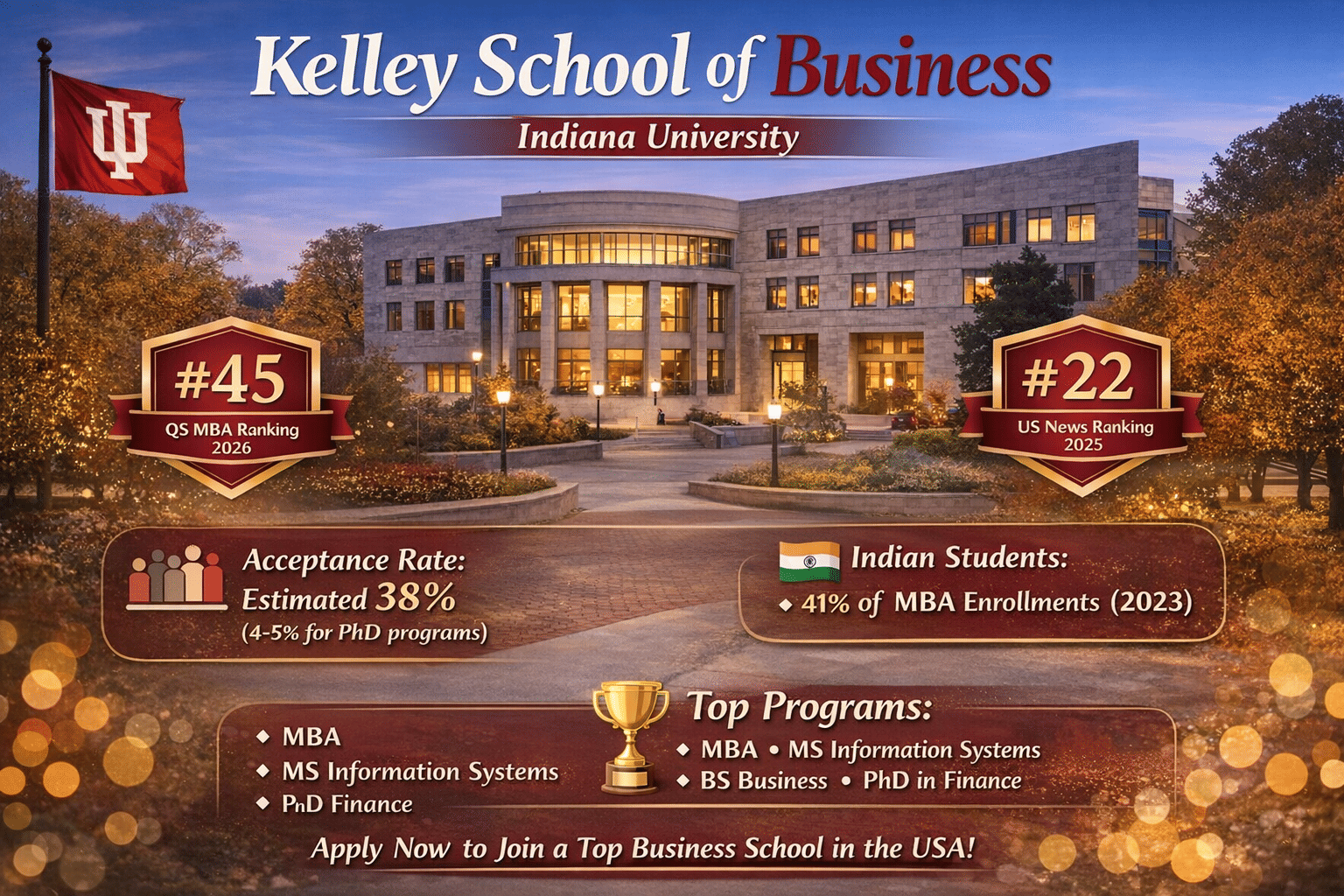 The Kelley School of Business is one of the top business schools in the USA. It has been ranked among the top universities by QS MBA (#45) in 2026. It has an estimated acceptance rate of 38%, which is considered relatively difficult. International students need to check all the required details before proceeding with the application.