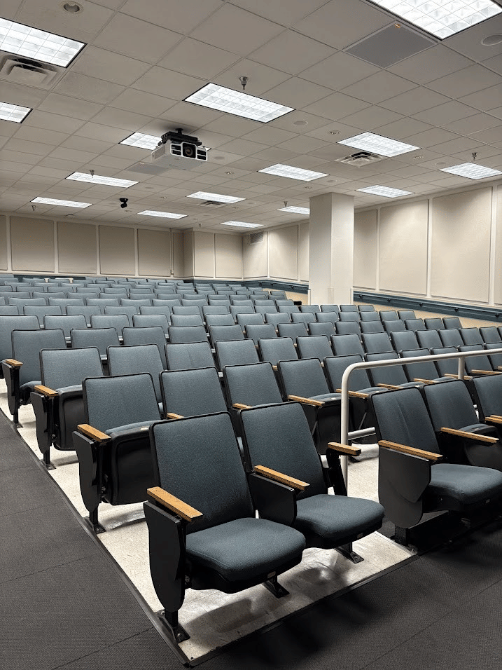 - The classrooms are well equipped with audio-visual system, live recording and noise cancellation features along with a tiered seating arrangement. This setup ensures that everyone has an unobstructed view of the front.
