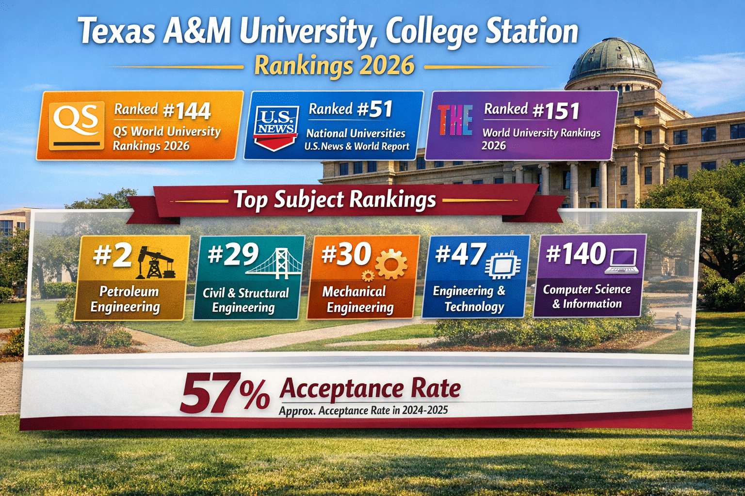 Texas A&M University has shown strong and consistent performance in global rankings, with a position of #144 in QS World University Rankings 2026 and #187 in U.S. News Best Global Universities 2025. These rankings reflect the university’s quality of education, research output, and global reputation.