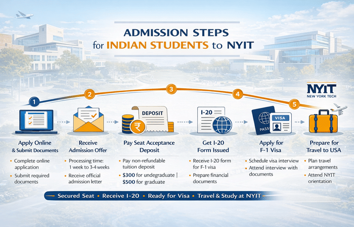 Overall, NYIT offers a student-friendly admission process with flexible academic requirements and multiple intakes, making it a good option for Indian students. With a good acceptance rate, students who meet the eligibility criteria, English proficiency requirements, and document checklist have a strong chance of admission. Applying early is recommended for better scholarship opportunities and enough time for visa preparation.