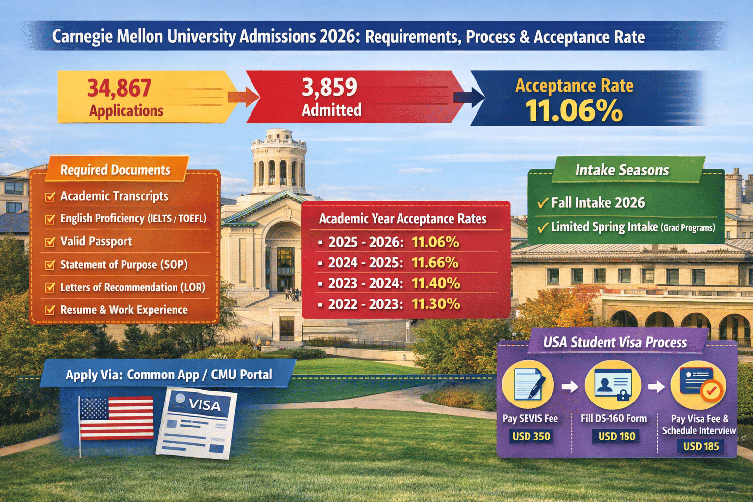 Carnegie Mellon University is known for its strong programs in computer science, engineering, business, and data science. For the 2026 intake, the university mainly offers admission in the Fall intake, while the Spring intake is limited to selected graduate programs. As per the official Common Data Set (2025 - 2026), a total of 34,867 students applied, out of which 3,859 were admitted, resulting in a highly competitive acceptance rate of 11.06%. This shows the university’s high preference among students.
