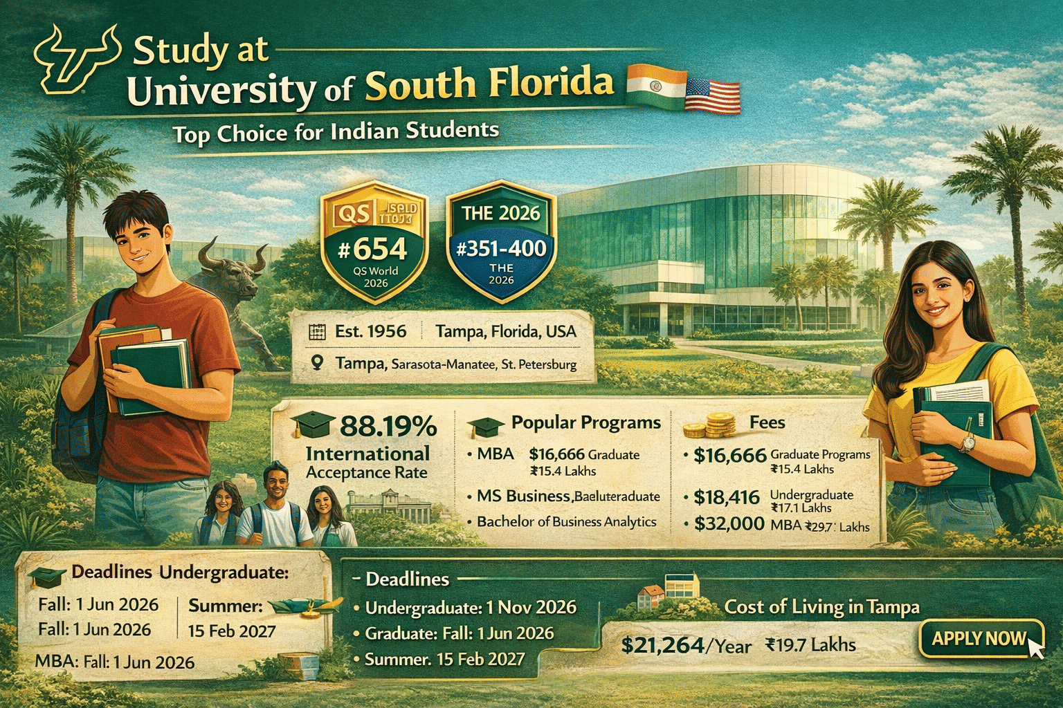 The University of South Florida is a public research university established in 1956. It is located in Tampa, USA. It has 3 campuses: Tampa (Main campus), Sarasota Manatee, and St.Petersburg. USF is consistently ranked among global universities, placed at #654 by QS World University Rankings 2026 and #351-400 by THE 2026. It is especially known for programs such as MBA, Master of Public Health, MS Business Analytics, and Bachelor of Business Analytics, which are popular among Indian students.