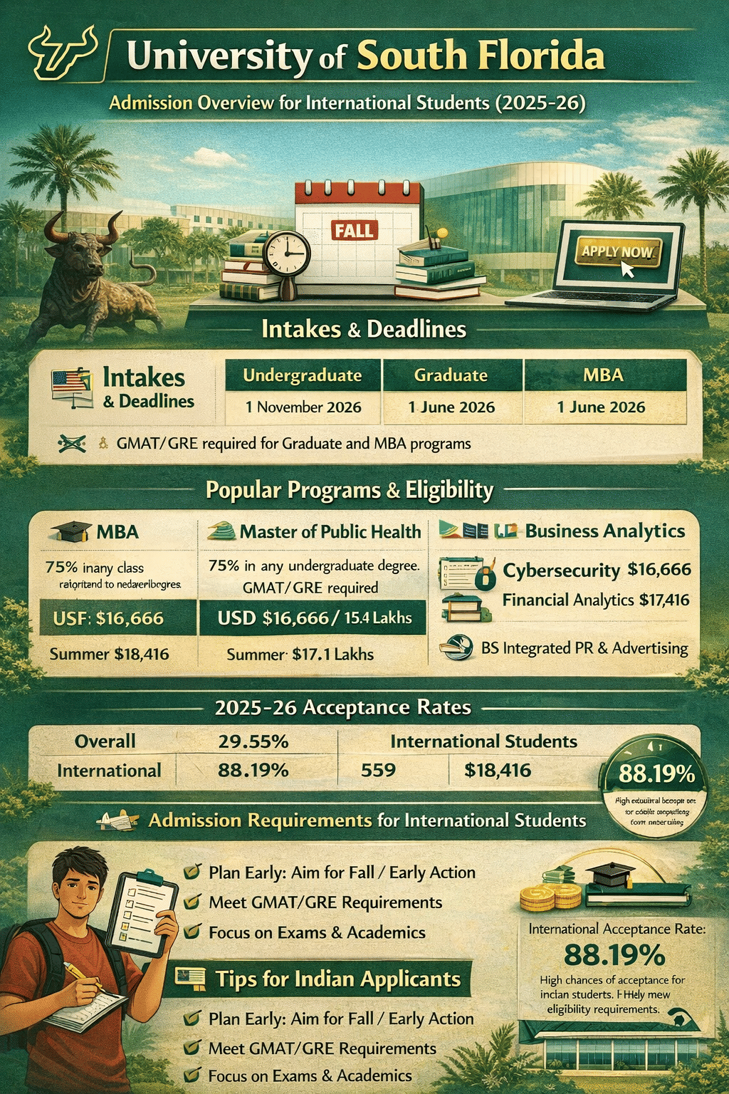 Applicants applying to the University of South Florida must ensure they meet the academic eligibility criteria, submit required documents on time, and apply within the specified deadlines for their intended intake.