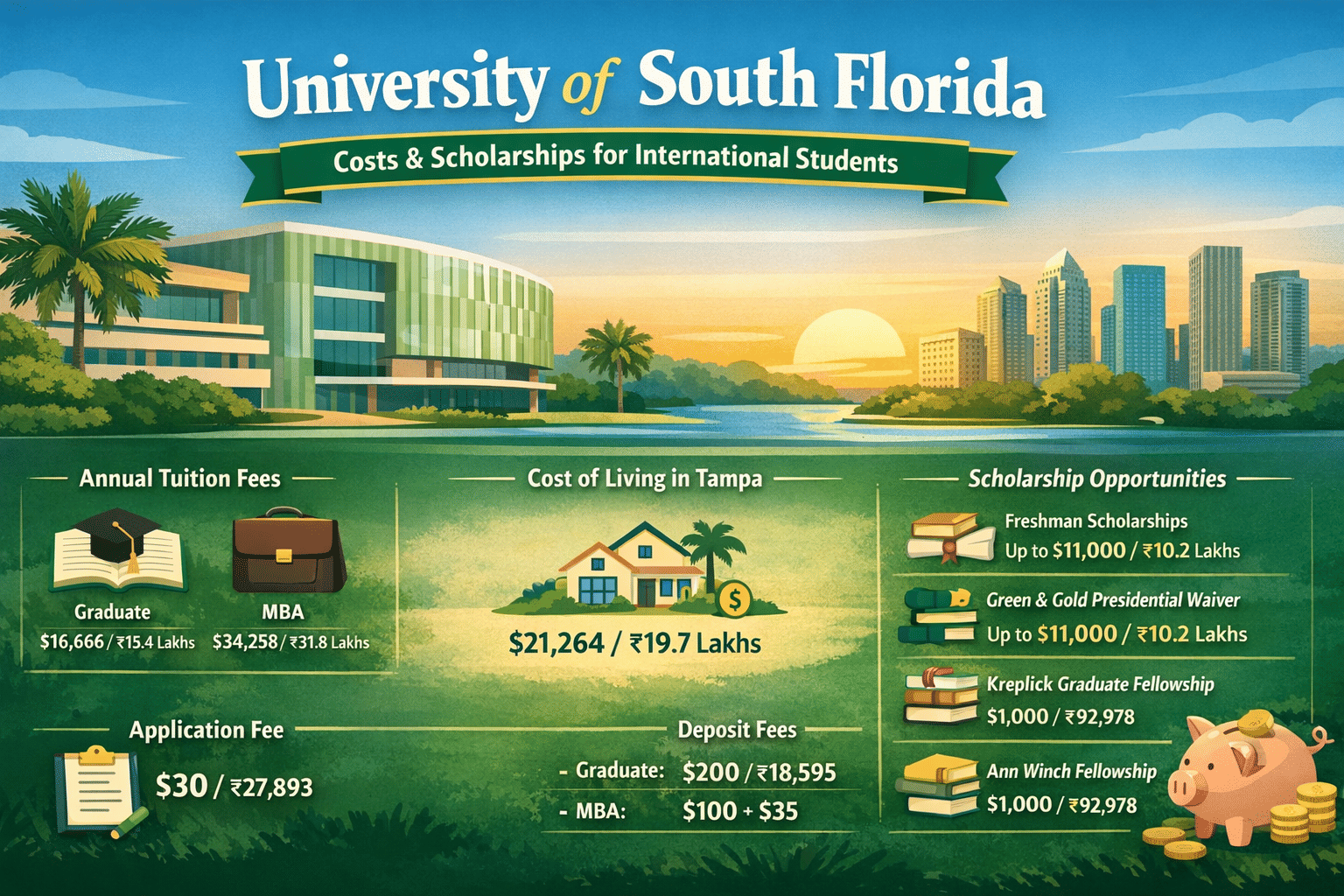 As per the University of South Florida Student Service page, the annual expenses for international students living in Tampa can range between USD 21,264 / INR 19.7 Lakhs.