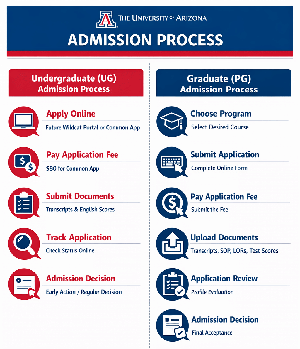 Applicants can apply through the Common App (undergraduate) or the University of Arizona Graduate Application Portal, with an application fee of $80–$90 (₹7,433 – ₹8,357). Graduate students must apply through the University of Arizona Graduate Application Portal ($90 | ₹8,357).