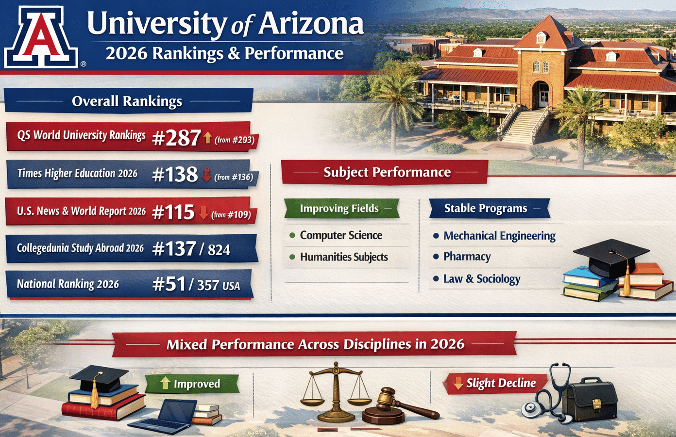 The University of Arizona has earned notable recognition across a variety of global and national ranking platforms in 2026. Rankings published by leading bodies such as QS World University Rankings, Times Higher Education, and U.S. News & World Report highlight the university’s diverse academic impact and growing global reputation.