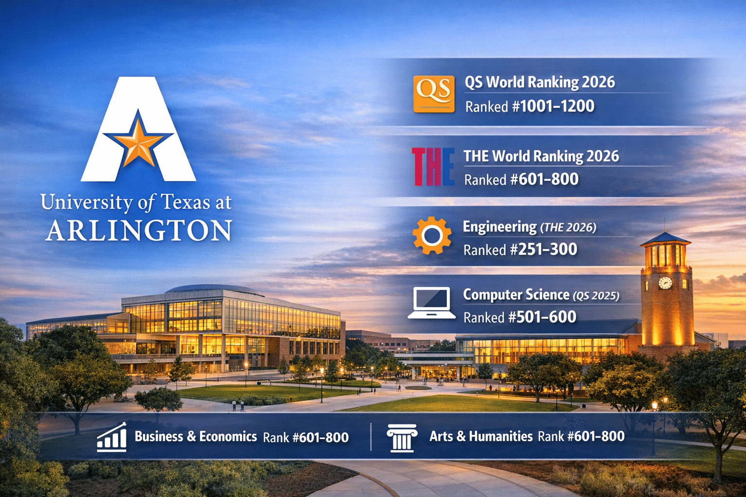 The University of Texas at Arlington (UTA) has established itself as a globally recognized public research university, consistently appearing in major international rankings such as QS, THE, US News, and ARWU Shanghai rankings. It has been ranked #1001-1200 by QS in 2026. THE has ranked the university #601-800 in 2026. UTA has maintained consistent rankings over the year, as per QS (from #1001-1200 in 2022 to #1001-1200 in 2026), and according to THE (from #601-800 in 2021 to #601-800 in 2026).
